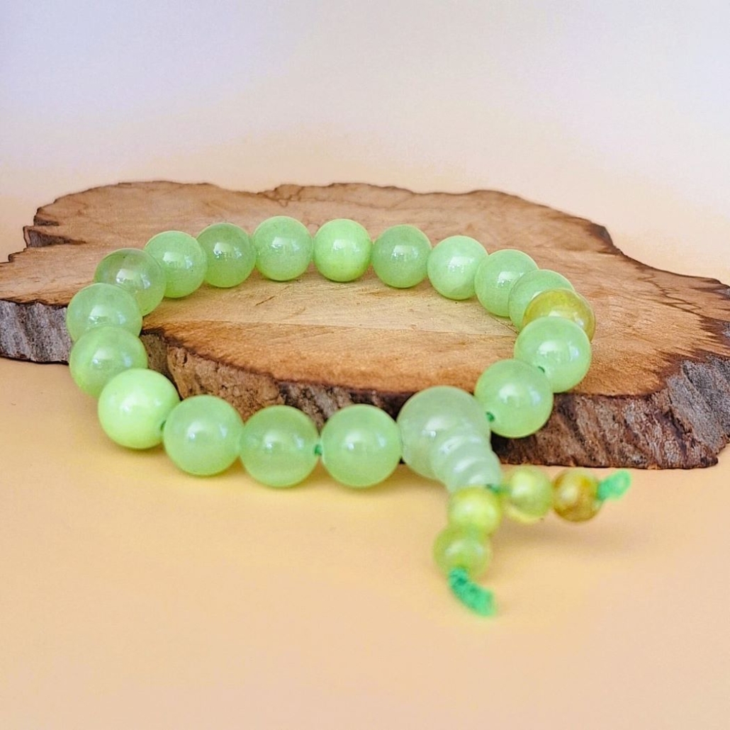 Description: 18 to 19cm elasticated bracelet with 10mm natural green jade beads & guru bead