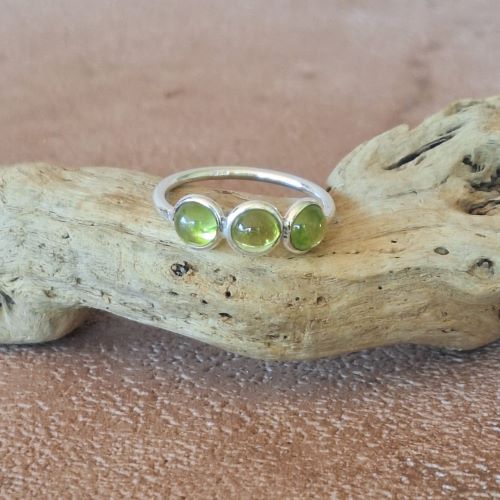 Sterling silver gemstone ring with 3 round cabochon shaped Peridot gemstones