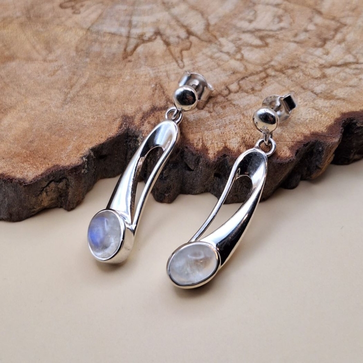 Sterling silver gemstone earrings with natural rainbow Moonstone cabachons