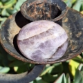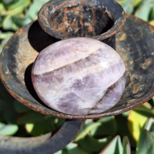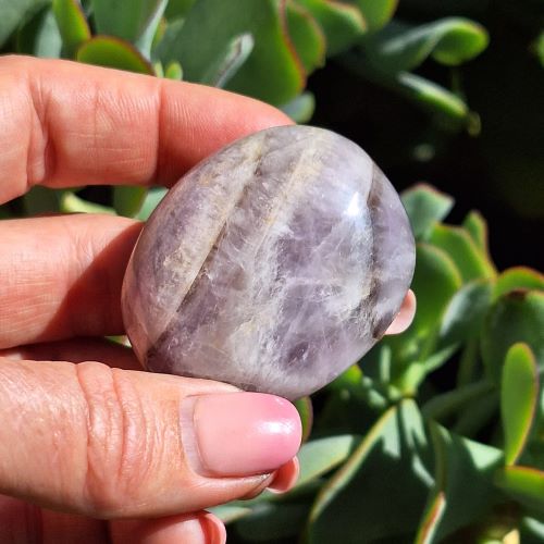 Banded amethyst palm stone, shaped to fit comfortably in your hand.