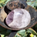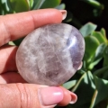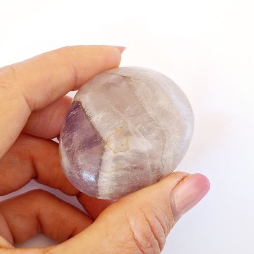 This palm stone is a combination of clear quartz, smoky quartz and amethyst