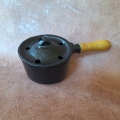 Cast Iron Metal container with lid and a wooden handle.