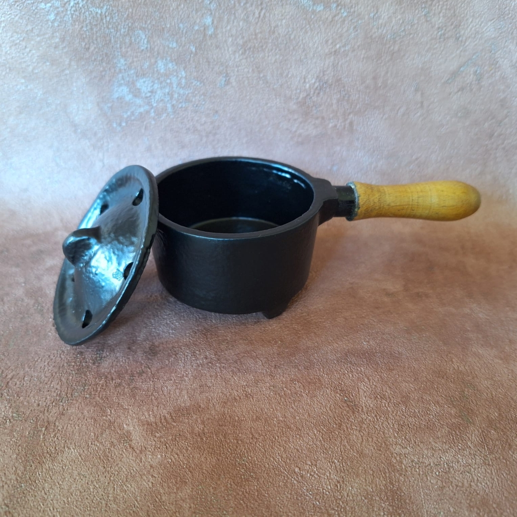This cast iron burner is used to burn the various resins (Frankincense, Myrrh, Dragon’s blood, etc) or dry herbs (Sage, Impepho, etc) together with the special charcoal to create a relaxing atmosphere in your healing or mediation space. it has a wooden handle to make it easy to work with.